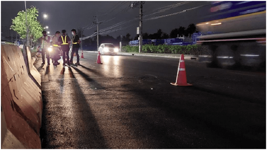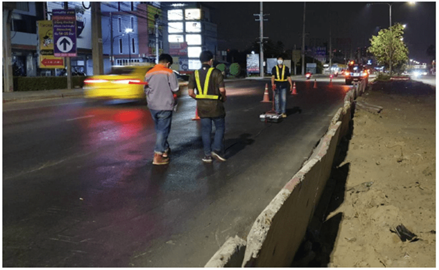 Determine the survey line and site conditions. The survey lines are shown in Figure 5. There are a total of 6 survey lines, each 40 meters long, covering 2 inner lanes on both sides, consisting of survey lines LINE R1 R2 R3 (R-Side) and survey lines LINE L1 L2 L3 (L-Side) (as shown in Figure 5). The condition of this area is the inner lane of the road. Left and right sides (as shown in Figure 6)