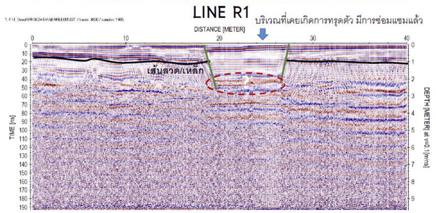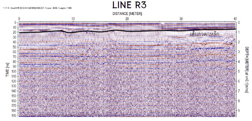The GPR results show the changes in the soil layer under the road surface. At a depth of about 2.5 meters, there are steel bars reinforced in the concrete layer to support the asphalt layers of different thicknesses. The survey results are presented in the form of lines from southeast to northwest (right → left).
