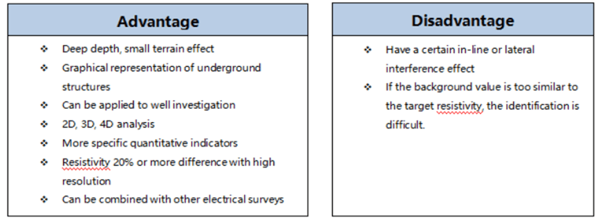 This method is particularly sensitive to the water content of the surrounding rock. If the surrounding rock is broken and contains water, its apparent resistivity is significantly reduced. The apparent resistivity of intact and hard rock and soil is significantly higher than that of the surrounding rock in the fault zone or broken zone and water-rich zone. This method has a clear principle and intuitive images. It is a geophysical method with high resolution. In recent years, with the improvement of computer data acquisition technology, the exploration efficiency has been greatly improved, the coverage area and detection depth of the profile have been increased, reliable data can be obtained in a strong interference environment, the signal-to-noise ratio has been greatly improved, and the geological body can be accurately detected. This method has been widely and successfully applied in engineering and hydrogeological exploration and exploration of mineral and water resources.