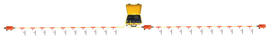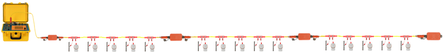 - Patented segmented distributed cabling system compatible with ground/cross-hole/borehole-surface/waterborne surveys. Customizable 5-10m cable spacing.