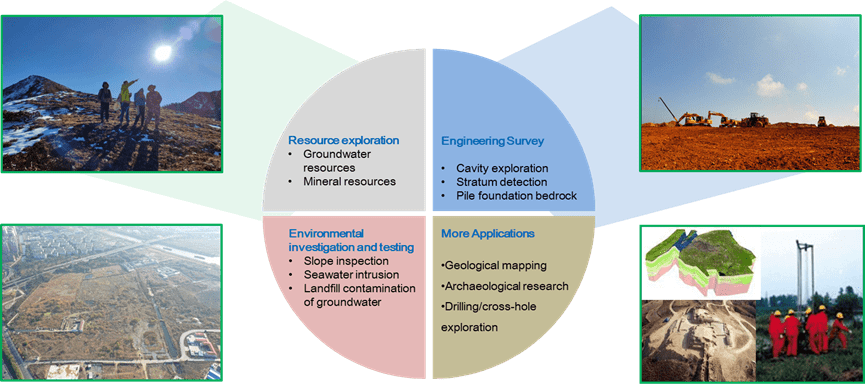 The system can be widely used in metal and non-metal mineral resource exploration, urban geophysical exploration, railway bridge exploration, etc. It is also used in hydrological and engineering geological exploration such as finding groundwater, determining the location of hidden dangers in reservoir dam foundations and flood control embankments, and can also be used for geothermal exploration.