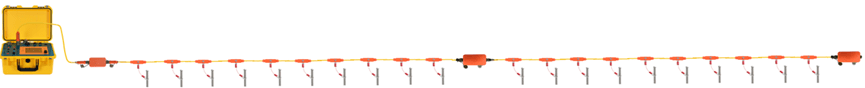 - Patented segmented distributed cabling system compatible with ground/cross-hole/borehole-surface/waterborne surveys. Customizable 5-10m cable spacing.