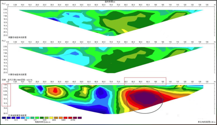 The resistivity anomaly images that meet the above three principles are interpreted as karst. Some karsts are completely filled without upper cavities, especially the karsts hidden below the groundwater level, which are completely filled with loose materials and water, showing strong low-resistance characteristics.